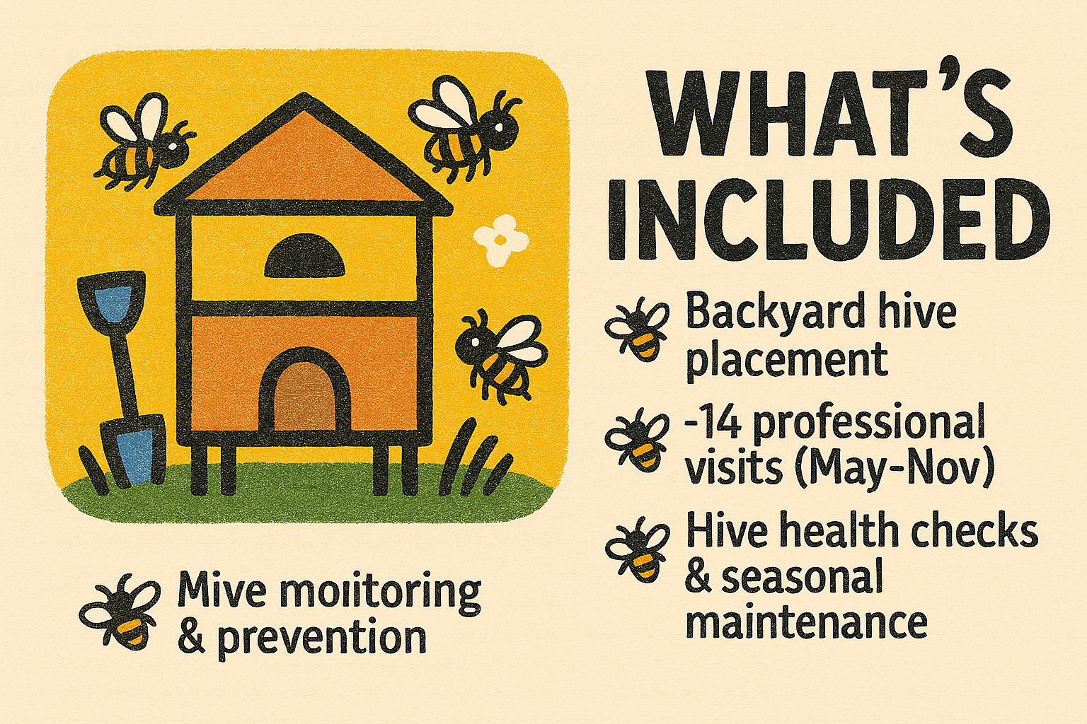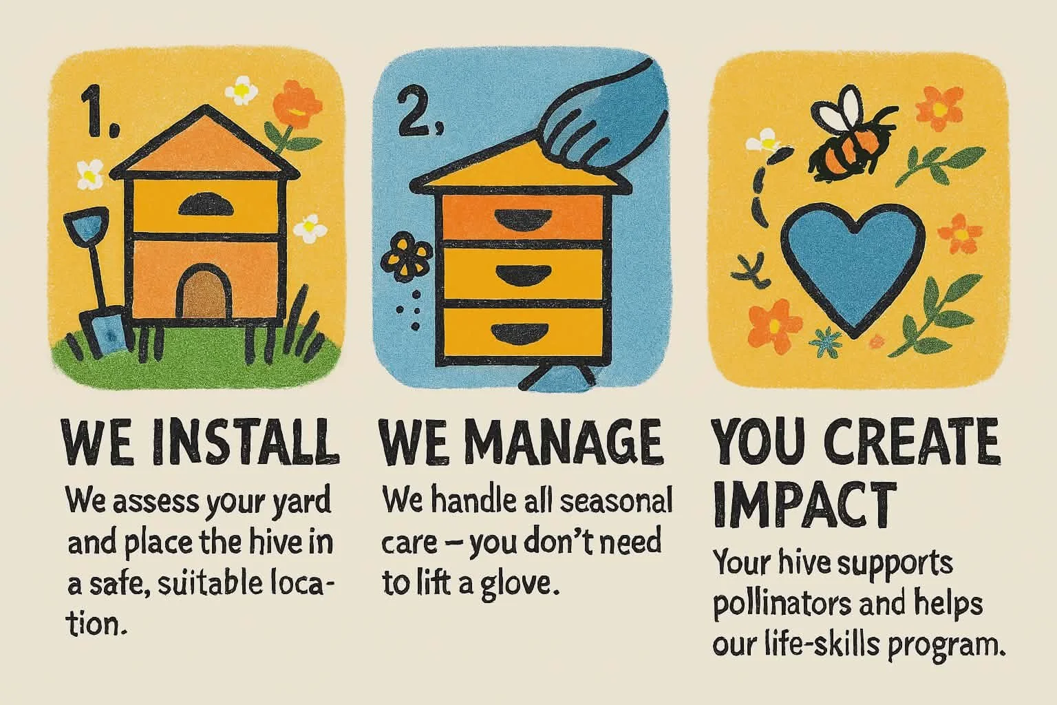 We place a fully managed honeybee hive in your yard and care for it throughout the season — May through November — so you can enjoy the benefits of healthy pollinators and support a meaningful community mission at the same time.